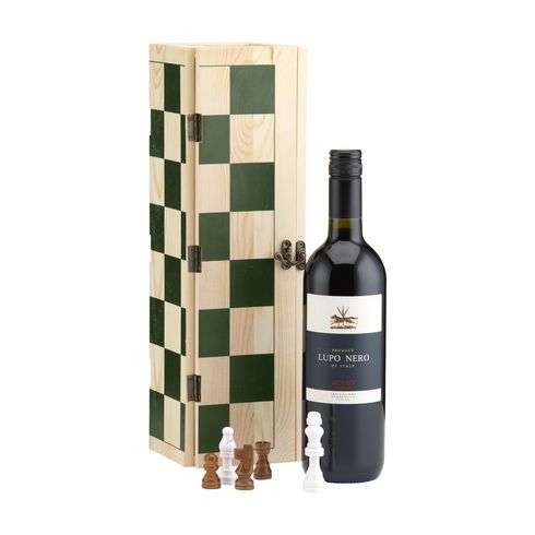 Cutie sticlă vin formă joc șah – 2 în 1 – cutie cadou pentru vin și joc de șah într-unul singur. O cutie cadou pentru o sticlă de vin. Cutia se deschide complet pentru a dezvălui un joc de societate complet. Conține piese de șah din lemn. Cadoul perfect pentru o seară de jocuri reușită.