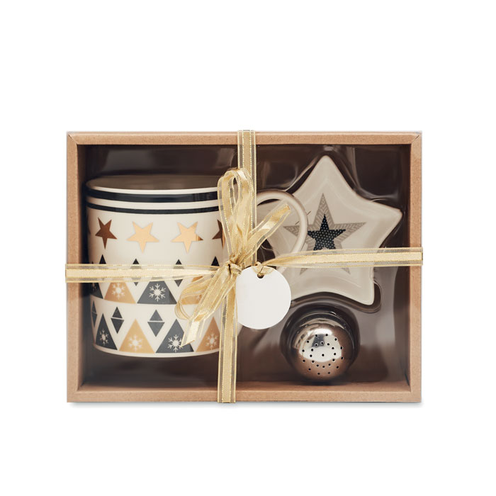 Set ceai – cană ceramică, filtru de ceai și farfurie mică. Prezentat în cutie de carton cu manșon din PVC și șnur cu etichetă.