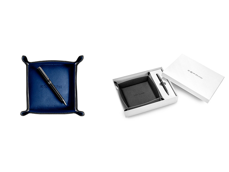 Îmbunătățiți-vă biroul cu acest set sofisticat de două piese, ambalat elegant într-o cutie cadou. Setul include un suport tip tavă (valet tray) gri pentru organizarea obiectelor esențiale și un pix metalic negru mat, cu detalii în nuanță gunmetal și logo gravat cu laser. Tava are partea inferioară căptușită pentru protecție suplimentară, iar pixul are mecanism de deschidere prin răsucire.